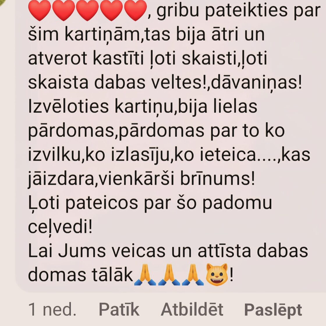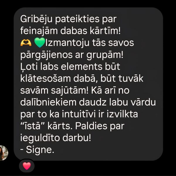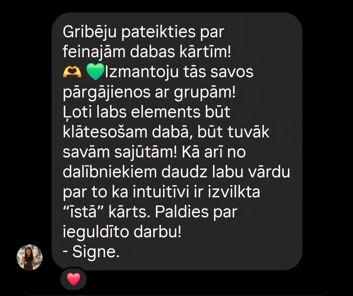 Regulāri pavadu laiku dabā apzināti un man patīk vērot to, ko daba vēlas pateikt. Ar interesi sajūtu un iztulkoju šos simbolus, līdz ar to biju priecīga, ka tiek radīts šāds pasākums, kurā katru dienu izvelkam kārti, savienojamies ar šo dabas simbolu un vērojam, kā dienas laikā tas izpaužas. Dienas bija dažādas - vienu dienu simbols un ar to saistītie atslēgas vārdi bija atklāti manāmi, taču citā dienā it kā nebija nekas tik acīm redzams. Interesanti bija vērot, kā konkrētās dienas simbols sasaucās arī ar divu vai trīs iepriekšējo dienu simboliem un kā izveidojas koptēls, kur viens otru papildina.