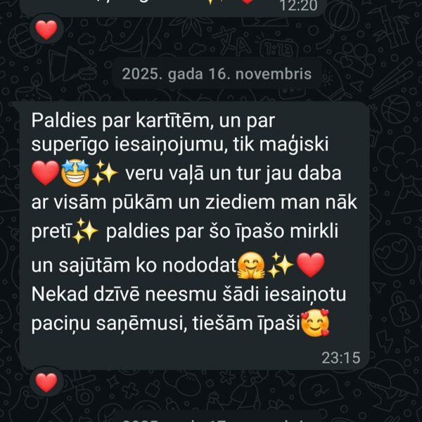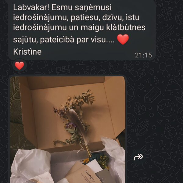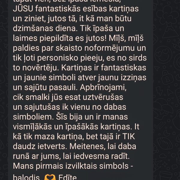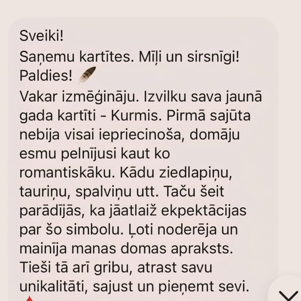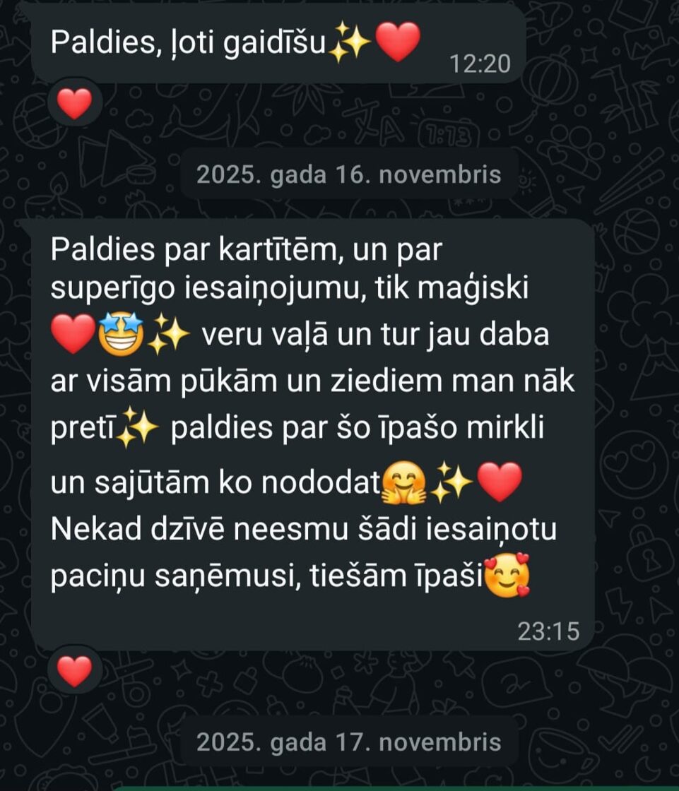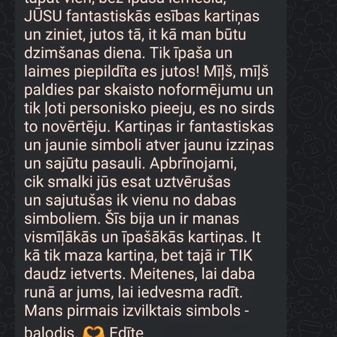 Regulāri pavadu laiku dabā apzināti un man patīk vērot to, ko daba vēlas pateikt. Ar interesi sajūtu un iztulkoju šos simbolus, līdz ar to biju priecīga, ka tiek radīts šāds pasākums, kurā katru dienu izvelkam kārti, savienojamies ar šo dabas simbolu un vērojam, kā dienas laikā tas izpaužas. Dienas bija dažādas - vienu dienu simbols un ar to saistītie atslēgas vārdi bija atklāti manāmi, taču citā dienā it kā nebija nekas tik acīm redzams. Interesanti bija vērot, kā konkrētās dienas simbols sasaucās arī ar divu vai trīs iepriekšējo dienu simboliem un kā izveidojas koptēls, kur viens otru papildina.