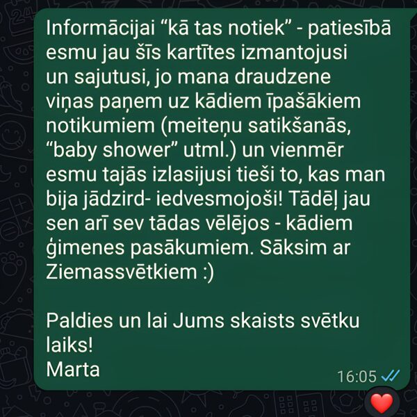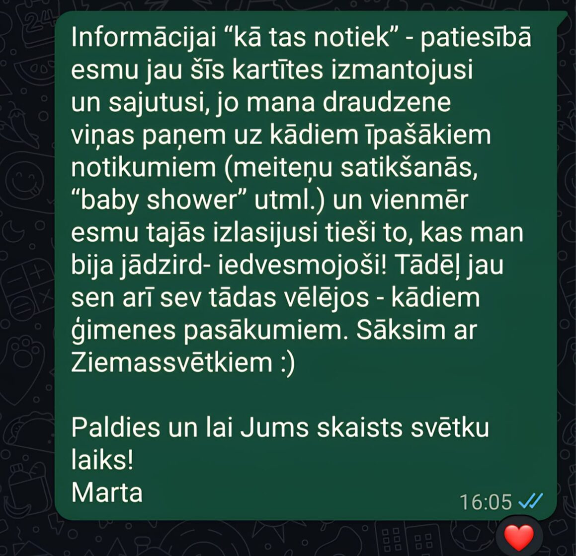 Grupas komunikācija bija brīnišķīga. Katrs varējām būt savā domu lidojumā, kur nav ne pareizi, ne nepareizi. Mēs varējām būt mēs paši, neizliekoties gudrāki vai labāki. Paldies par atbalstošo telpu, kuru atvērāt katram grupas dalībniekam. Paldies par īstumu.